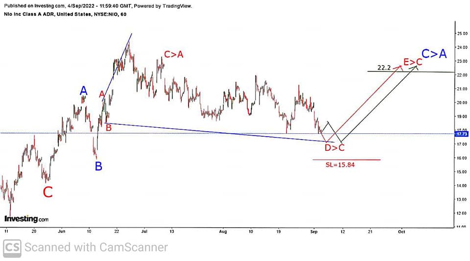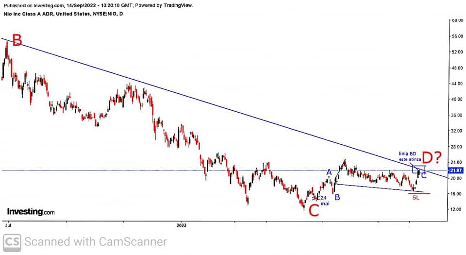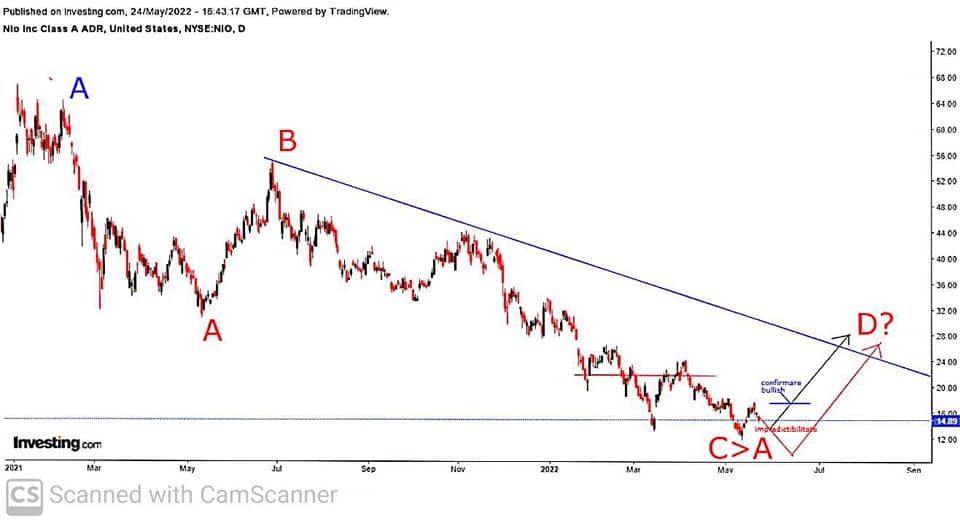 Pe graficul NIO din 24 mai ( cand era 14-15 $) atentionam ca valul C rosu de grad mare era pe final si NIO trebuia sa urce în lunile urmatoare spre zona 22-25 pe valul D rosu de grad mare astfel încât linia BD a triunghiului neutral sa fie ATINSA de pret .