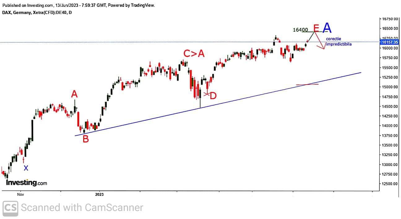 . În 13 iunie ( la 16150) anticipam ca DAX va urca spre targetul 16400 pe valul E al triunghiului neutral ce dureaza de 7 luni , după care DAX va corecta ..