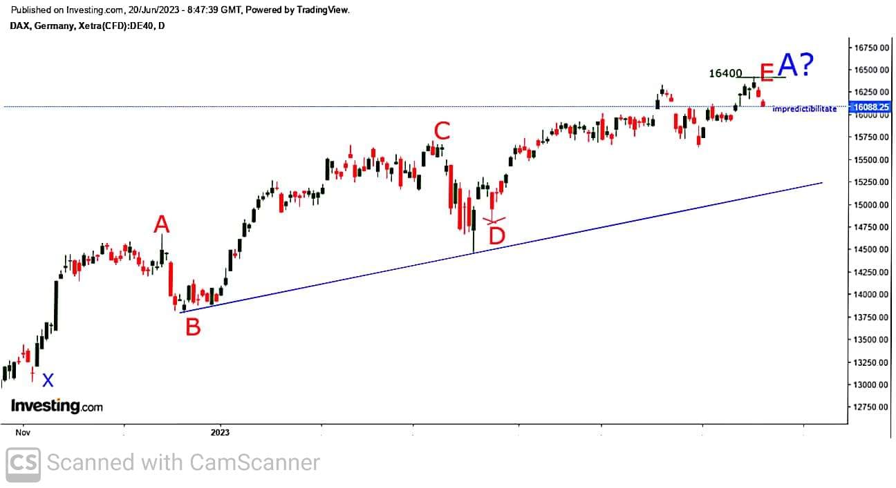 Vineri 16 iunie DAX a atins 16400 și de 2 zile cade , creste IMPREDICTIBILITATEA de acum, fiind posibile ambele variante : 1) caderea de acum sa fie doar un val X impredictibil si DAX sa urce din nou sau 2) sa inceapa o cadere mai mare …