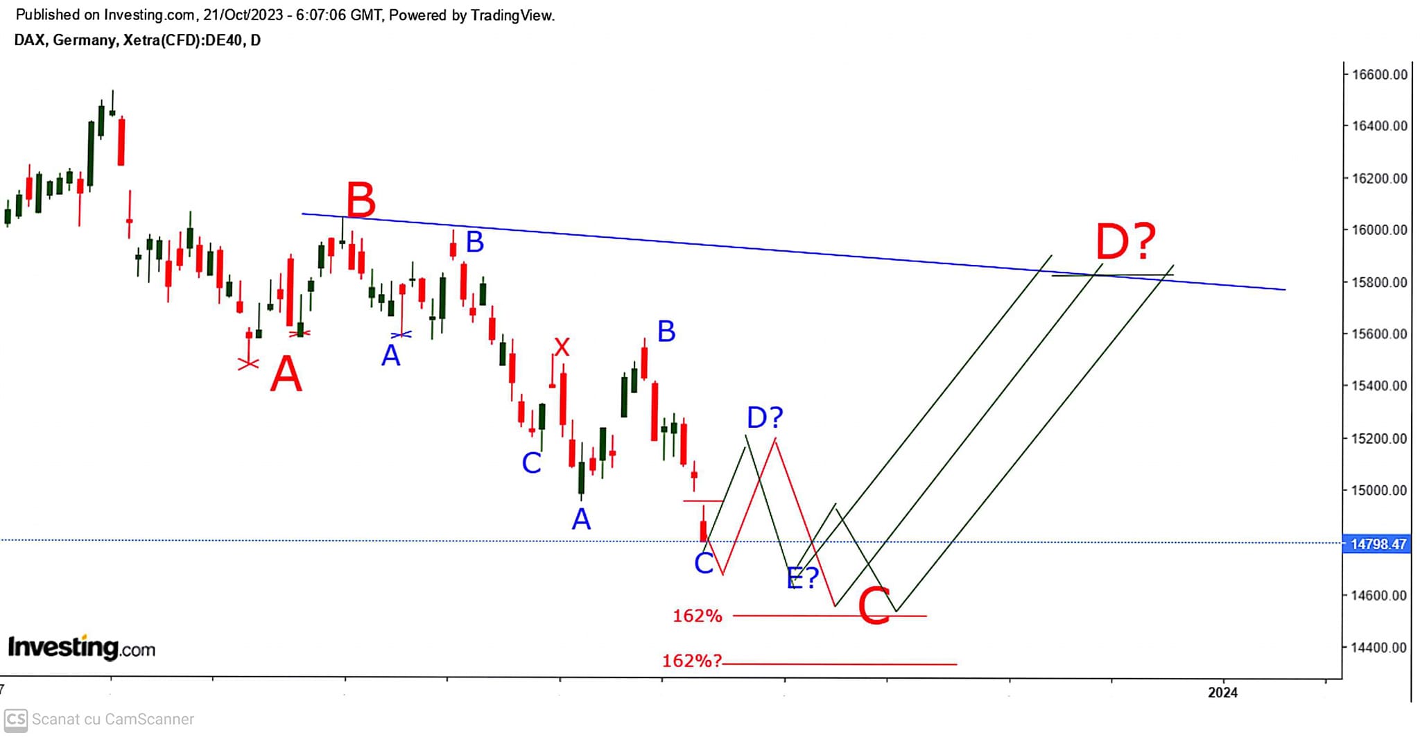 Pe graficul DAX din 21 octombrie la 14800, pe PESIMSIM MAXIM , atentionam abonatii ca valul C rosu de grad mare ( al triunghiului neutral) se apropie de final , limitele extreme de 162% erau aproape in zona 14400-14500 si anticipam cresterea DAX in urmatoarele saptamani luni pe valul D spre linia BD proxima trasata din zona 15800 .