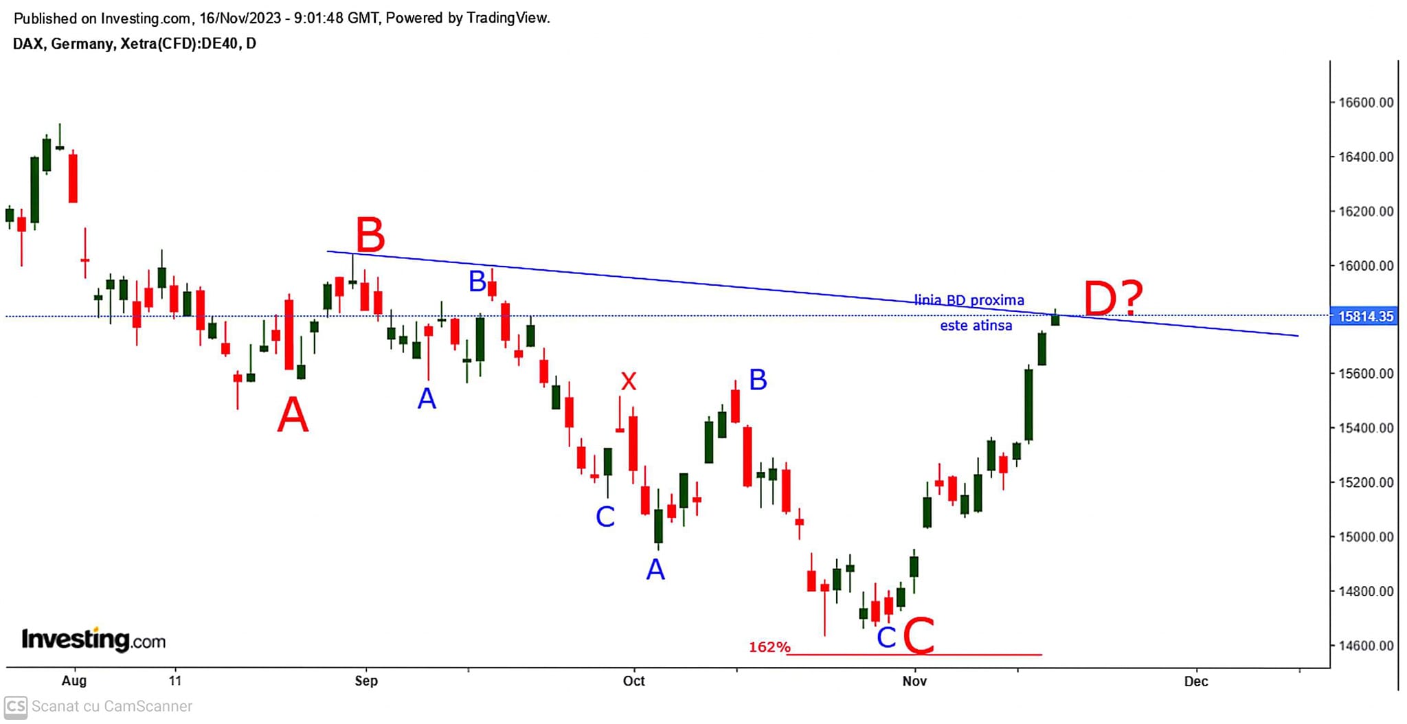 Azi 16 noiembrie DAX urca violent de cateva zile pe valul D rosu si atinge in zona 15800 linia BD proxima anticipata in 21 octombrie , dupa ce C rosu de grad mare s-a finalizat in 14650-14700 pe final de octombrie …