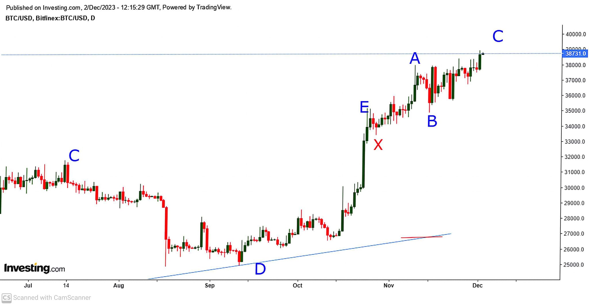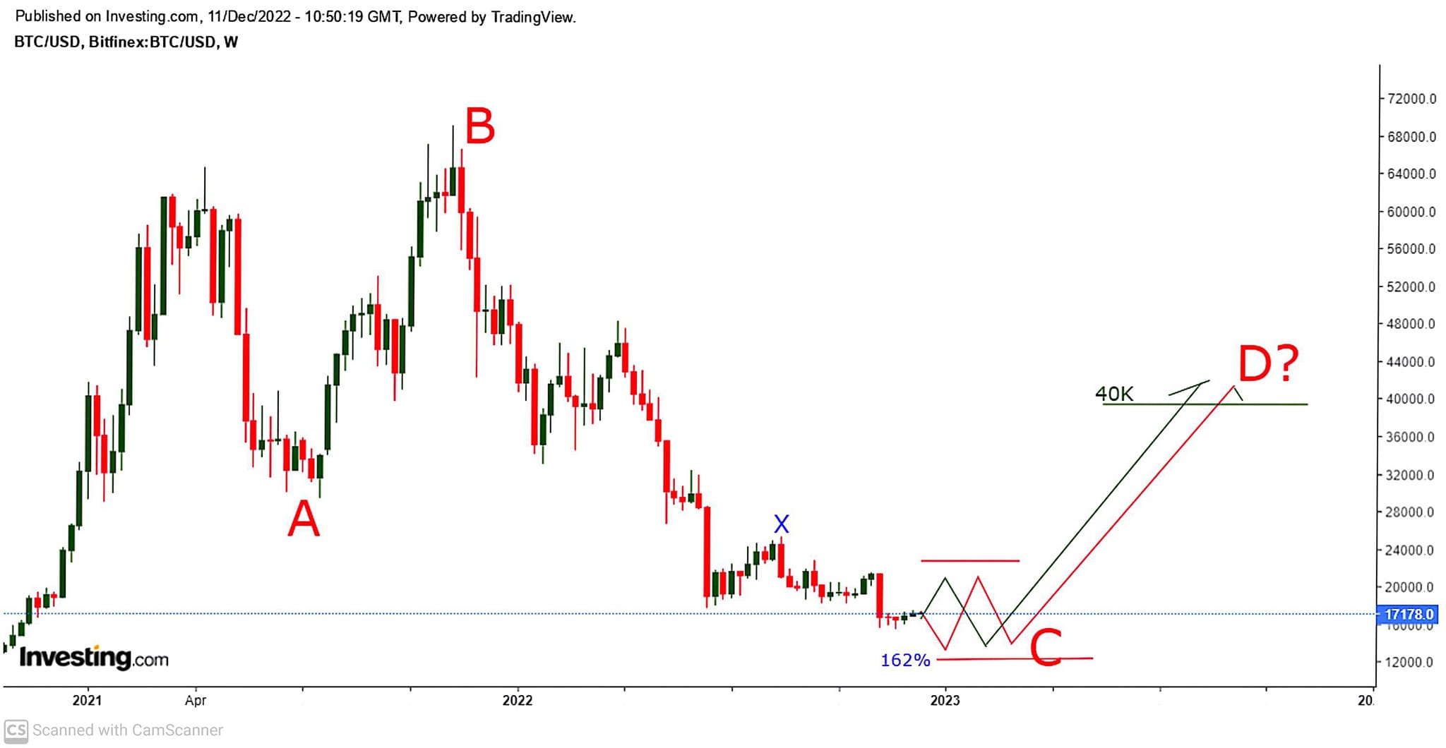 BITCOIN a fost destul de predictibil pana acum pentru mine, mai are puțin si urca pe valul D rosu de grad mare peste targetul 40k anticipat pe graficul din 11 decembrie 2022 , cand pe pesimism maxim la 17k atentionam abonatii sa ia BITCOIN pe termen lung.