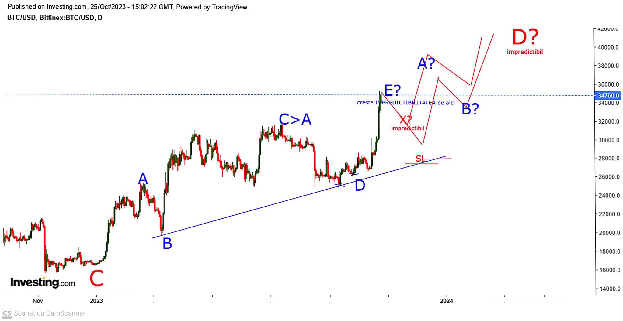 – dupa finalizarea lui E albastru de grad mic crestea IMPREDICTIBILITATEA, trebuia sa urmeze un X corectiv impredictibil în jos ce nu va sparge linia BD , apoi iar sus pe alt patern : flat ABC sau triunghi neutral clasic ce va ridica BITCOIN peste 40k .