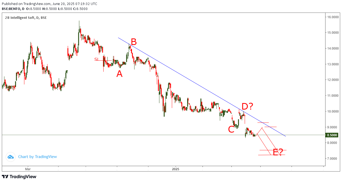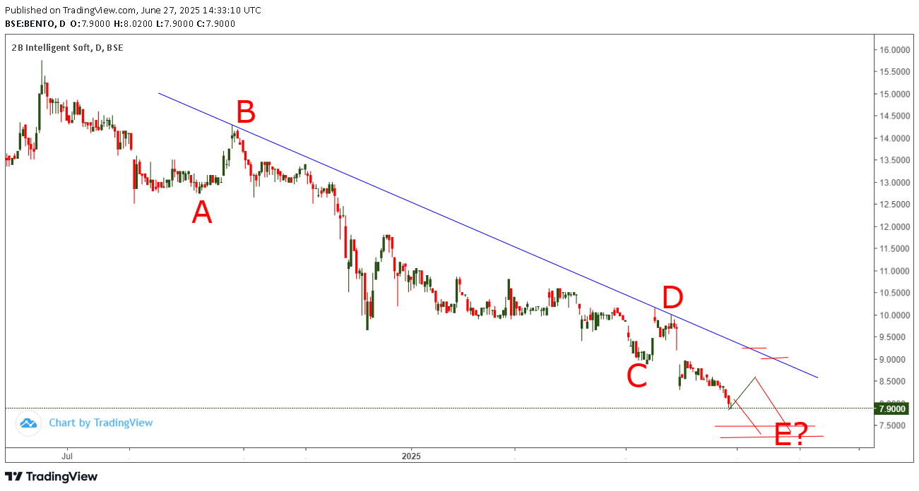 BENTO cade sub 8 , spre zona de target 7.5-7.1 afisata pe graficul din 20 iunie ,pe valul E al triunghiului neutral anticipat pe graficul BENTO trimis abonatilor in 20 iunie , cand era 8.5 …