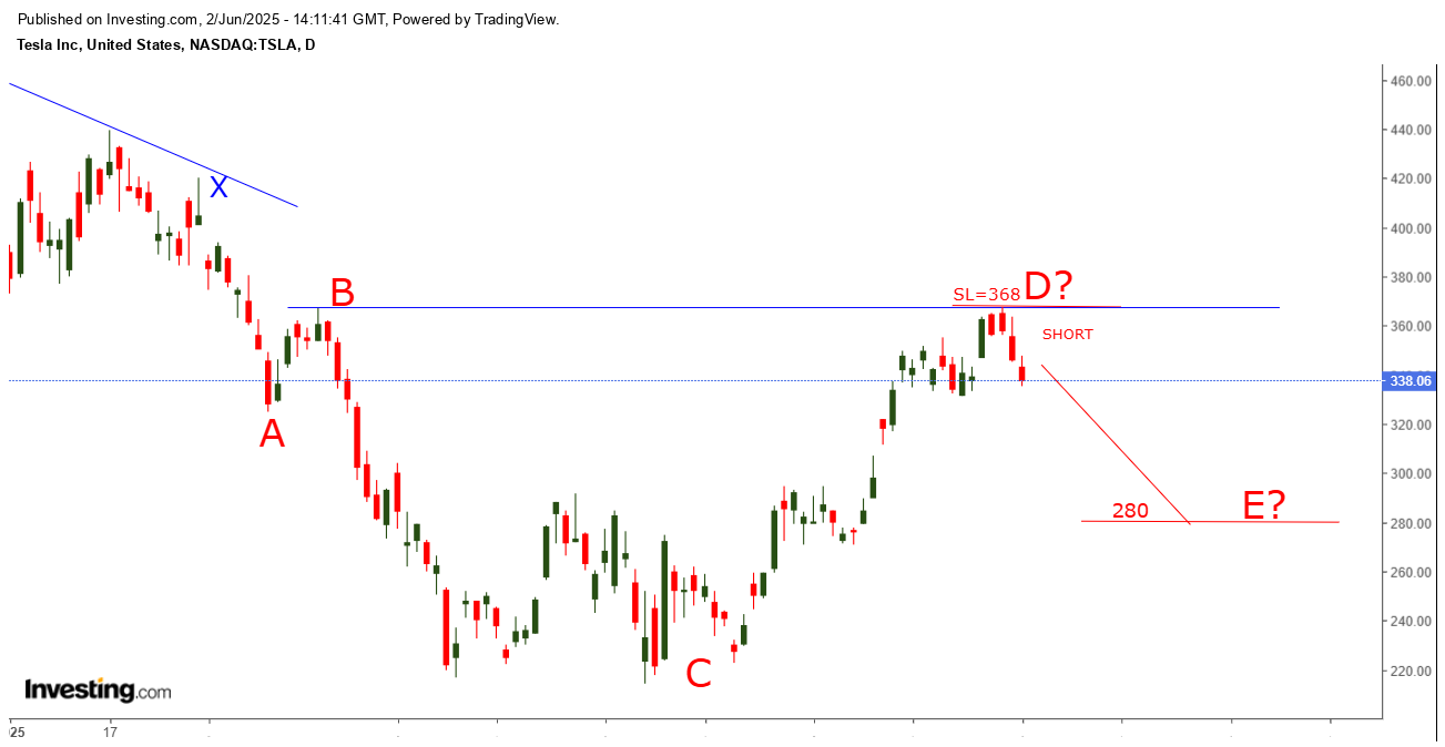 Valul X a ridicat TESLA pana in 358 fara a sparge linia BD , fiind OCAZIE BUNA de SHORT pentru abonati in zona 340-350 !!