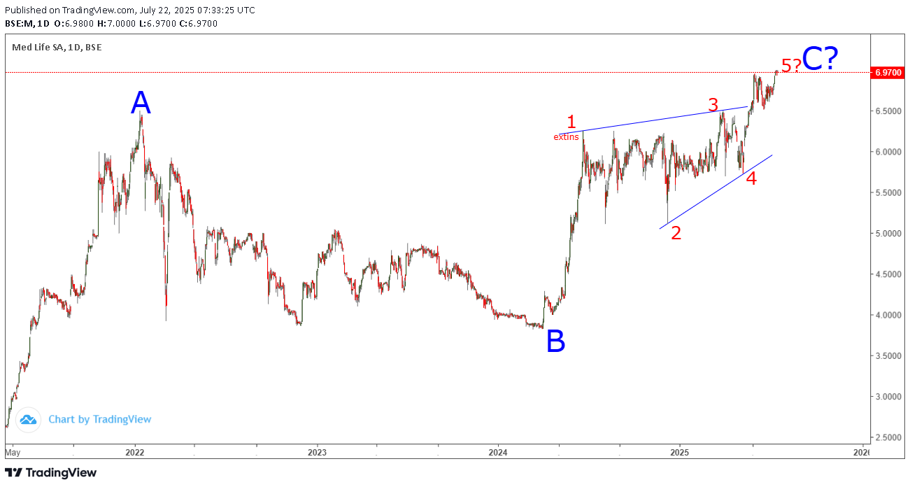 Fara sa intru in prea multe detalii tehnice , acest terminal C a inceput din aprilie 2024 si respecta conditiile de formare : valul 1 este extins (adica cel mai mare val din cele 5) , si acum MEDLIFE urca pe valul 5 al acestui terminal C din flatul ABC ..