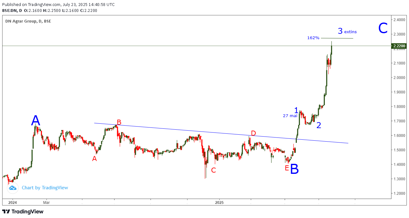 Dupa un val 2 scurt ce nu a corectat prea mult , DN urca violent de o luna pe valul 3 extins , inca putin si se apropie de pragul de 162% din valul 1 …