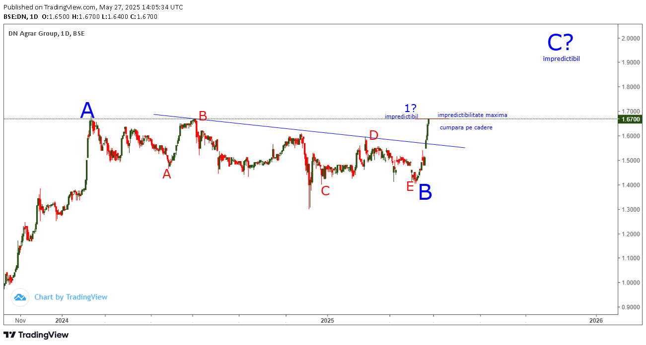 Pe graficul DN trimis abonatilor in 27 mai aratam ca DN urca atunci pe valul 1 al impulsului C de grad mare al zigzagului ABC , fara a da un target clar pentru impulsul C .