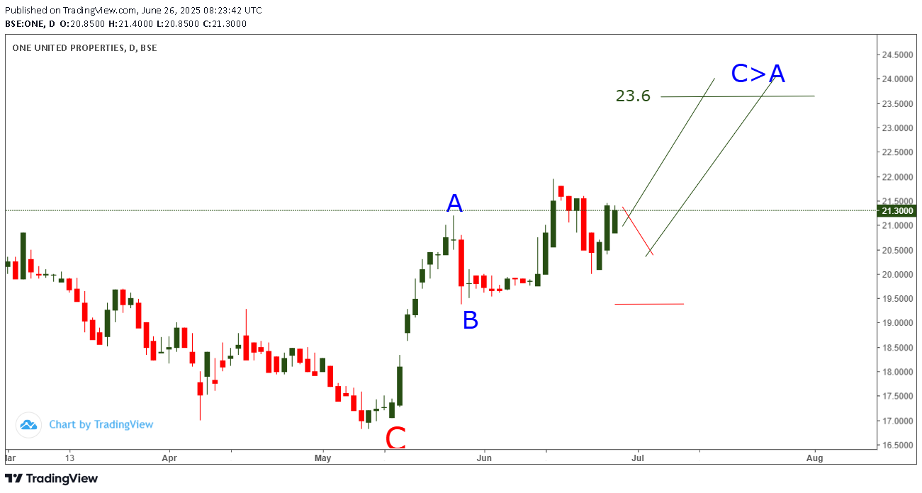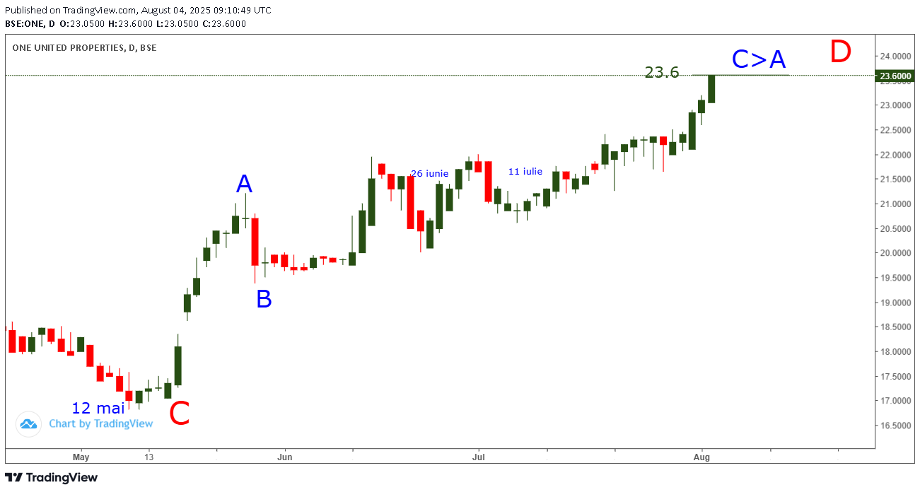 Pe graficul ONE din 26 iunie ( la 21.3) atentionam abonatii sa mai cumpere ONE deoarece anticipam inca crestere pe valul C albastru de grad mic ( al triunghiluiui neutral cu care incepea D rosu de grad mare) PESTE targetul 23.6 pentru ca C > A cum arat pe grafic .