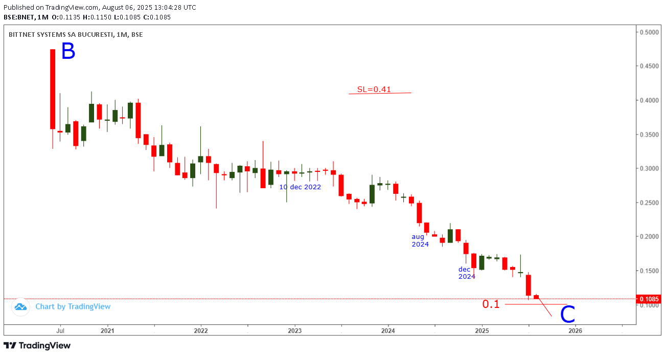 Pe graficul din decembrie 2024 anticipam ca BNET trebuie sa cada pe valul C sub 0.09 , mai jos decat initialul 0.1 specificat pe graficul din dec. 2022 .