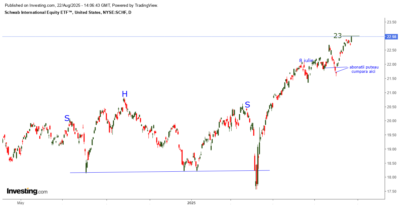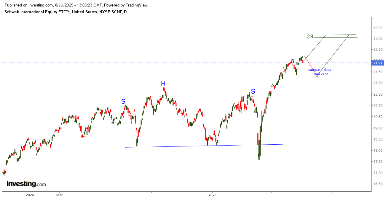 Pe graficul ETF-ului SCHF din 8 iulie ( la 21.9) atentionam abonatii sa cumpere SCHF pe orice posibila corectie care putea urma deoarece vedeam sa urce spre targetul 23 în urma esuarii HS top de pe grafic .