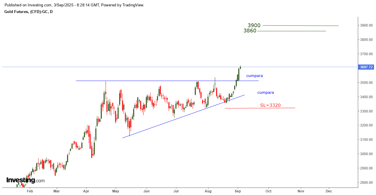 Pe graficul AUR pe termen scurt din 3 septembrie ( la 3600) , atentionam abonatii ca e de cumparat AUR atunci si pe orice posibila corectie in urma spargerii rezistentei 3510 , in ideea ca urma sa urce si mai sus , spre zona de target 3860-3900 !!!