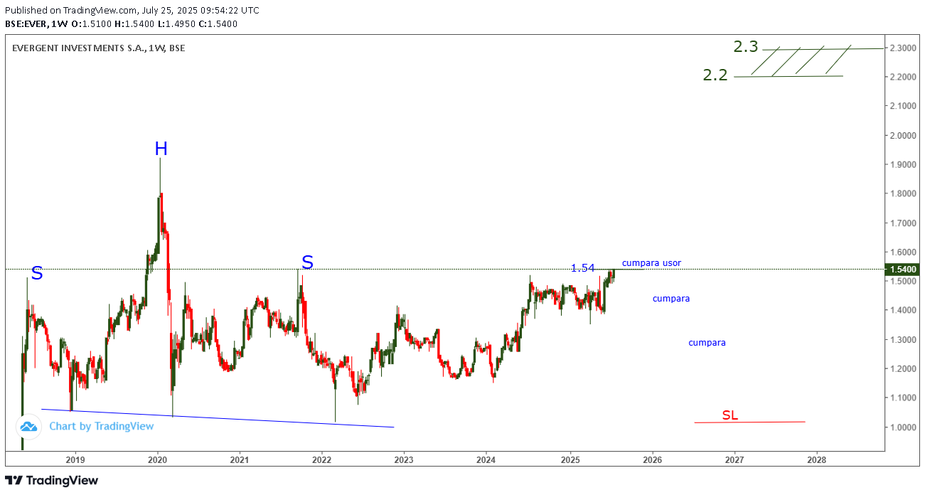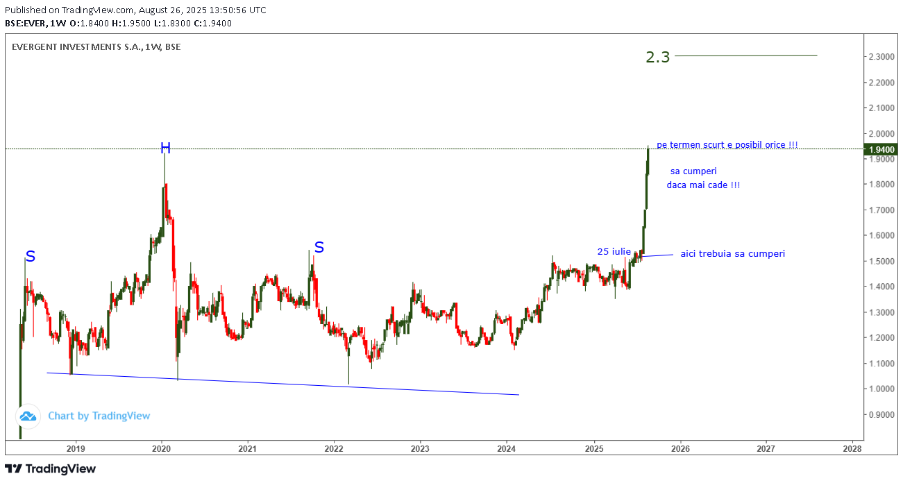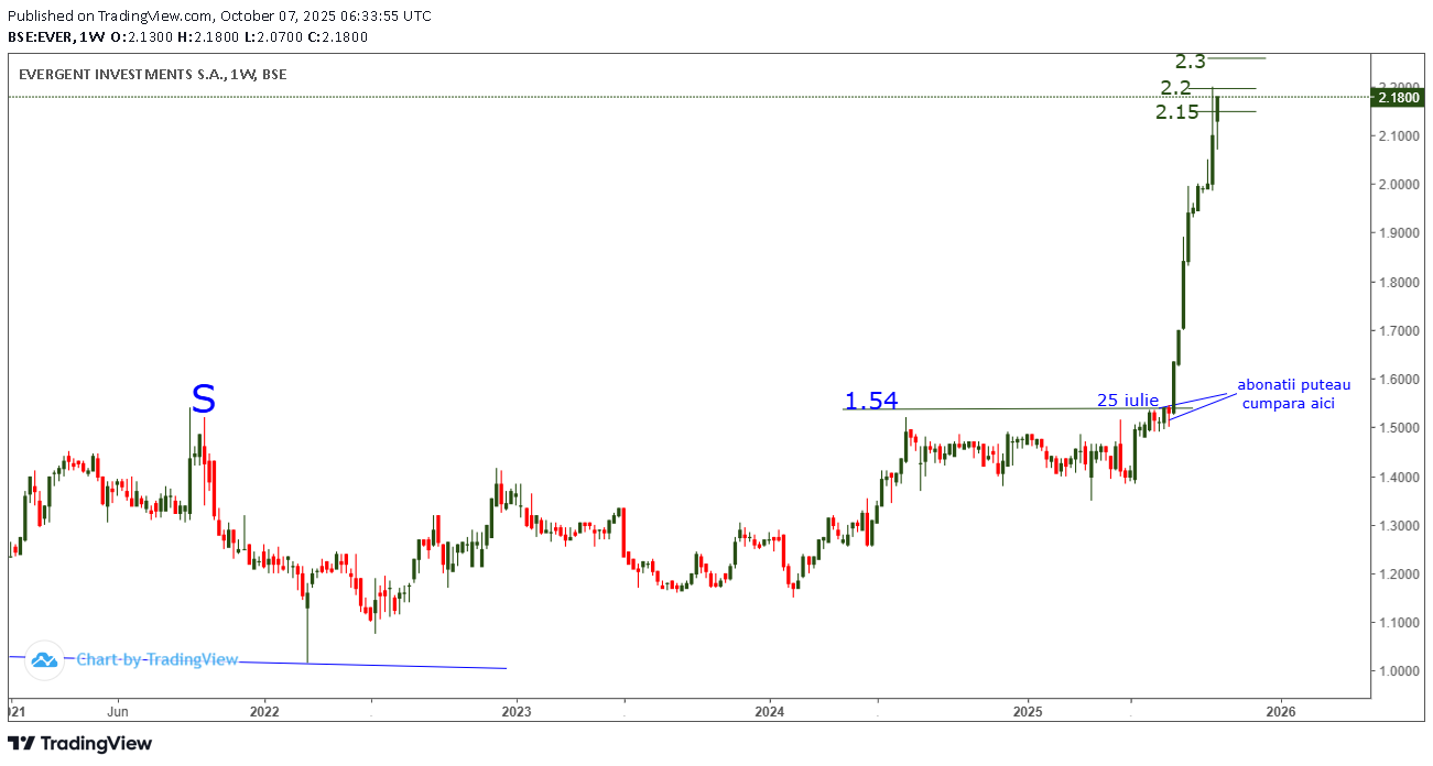 Dupa 1 an de stagnare , pe graficul EVER din 25 iulie 2025 ( la 1.54) EVER urca si spargea pragul 1.54 specificat pe primul grafic din 18 iulie 2024 , atentionand abonatii SA CUMPERE EVER atunci in ideea ca urma sa urce spre targetul 2.2- 2.3 specificat pe grafic !