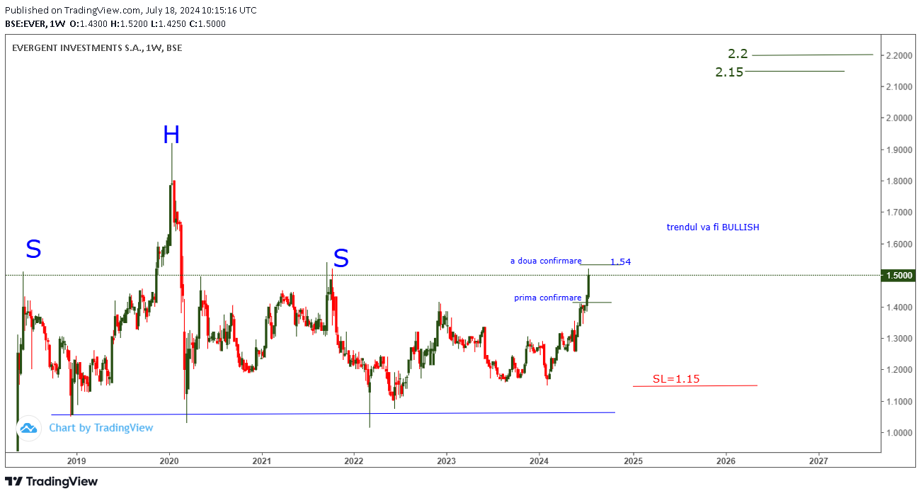 Pe graficul EVER ( fostul SIF2 ) din 18 iulie 2024 ( la 1.5) ATENTIONAM abonatii ca o spargere clara a pragului 1.54 va duce la eșuarea HS gigant format pe grafic , si va fi o confirmare bullish ca EVER ar trebui sa urce mult mai sus , spre zona de target 2.15 -2.2 specificata pe grafic .