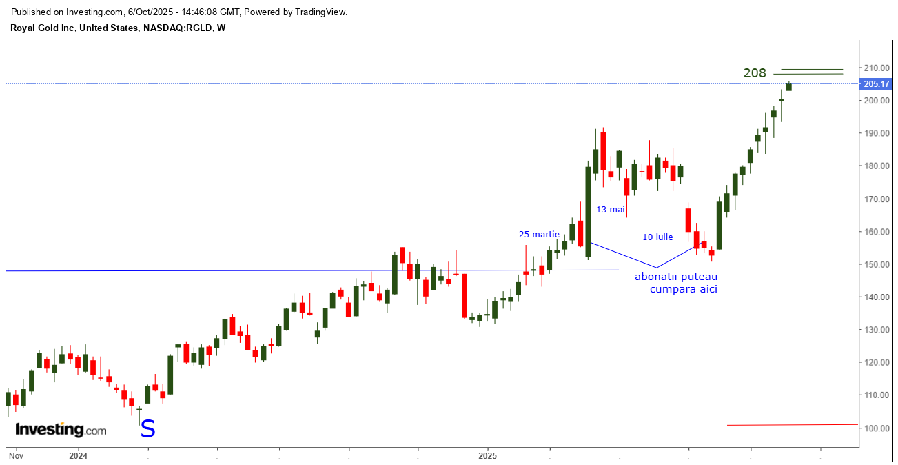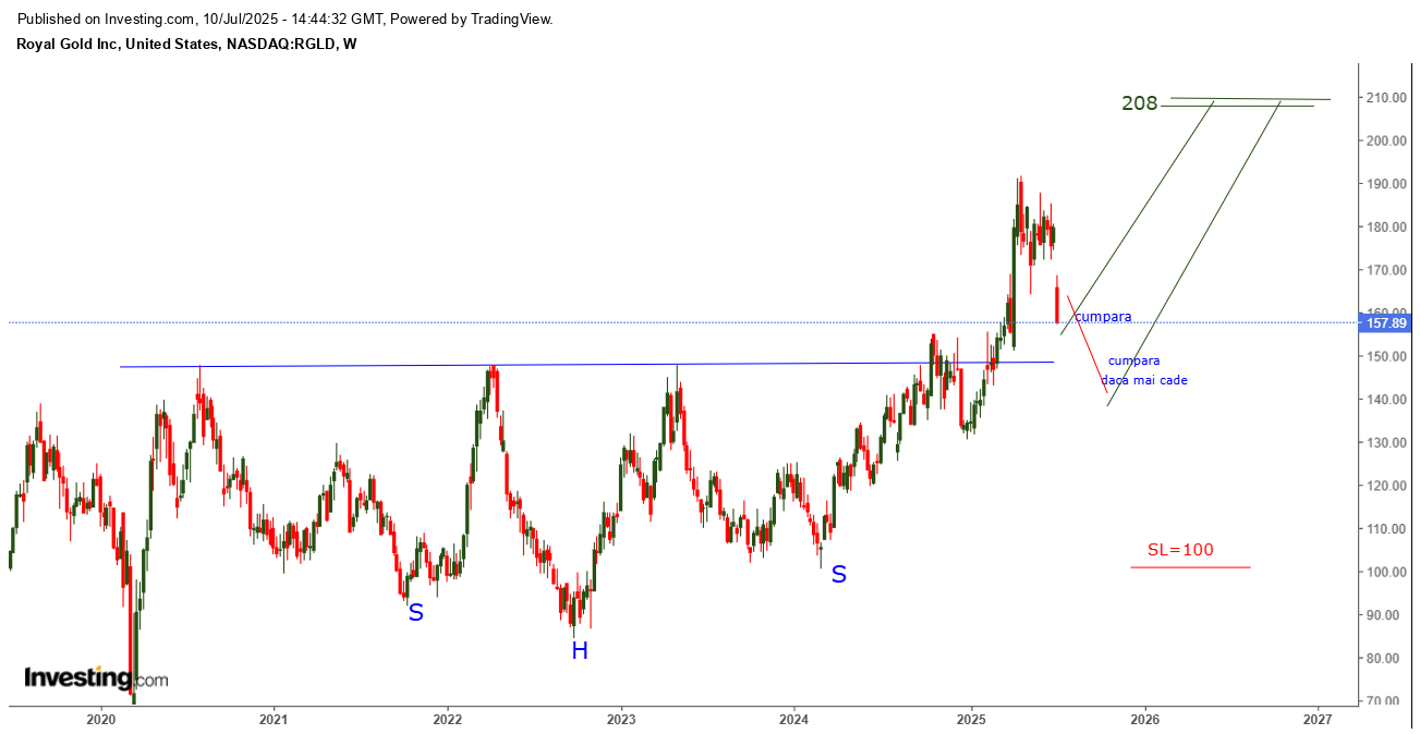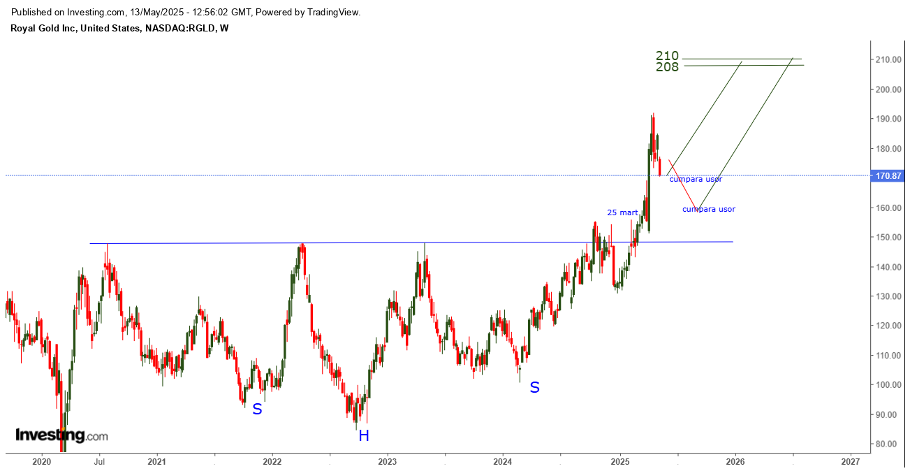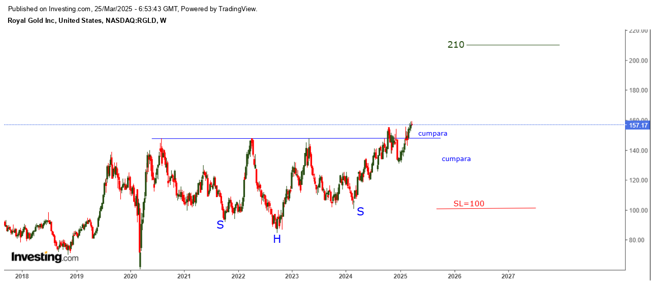 Pe graficul actiunii Royal Gold ( RGLD ) din SUA ( companie ce gestionează aurul si alte metale prețioase ) din 25 martie ( la 157) atentionam abonatii sa cumpere RGLD pe spargerea rezistentei HS gigant de continuare format pe grafic in ideea ca trebuia sa urce spre targetul 208-210 pe termen lung .