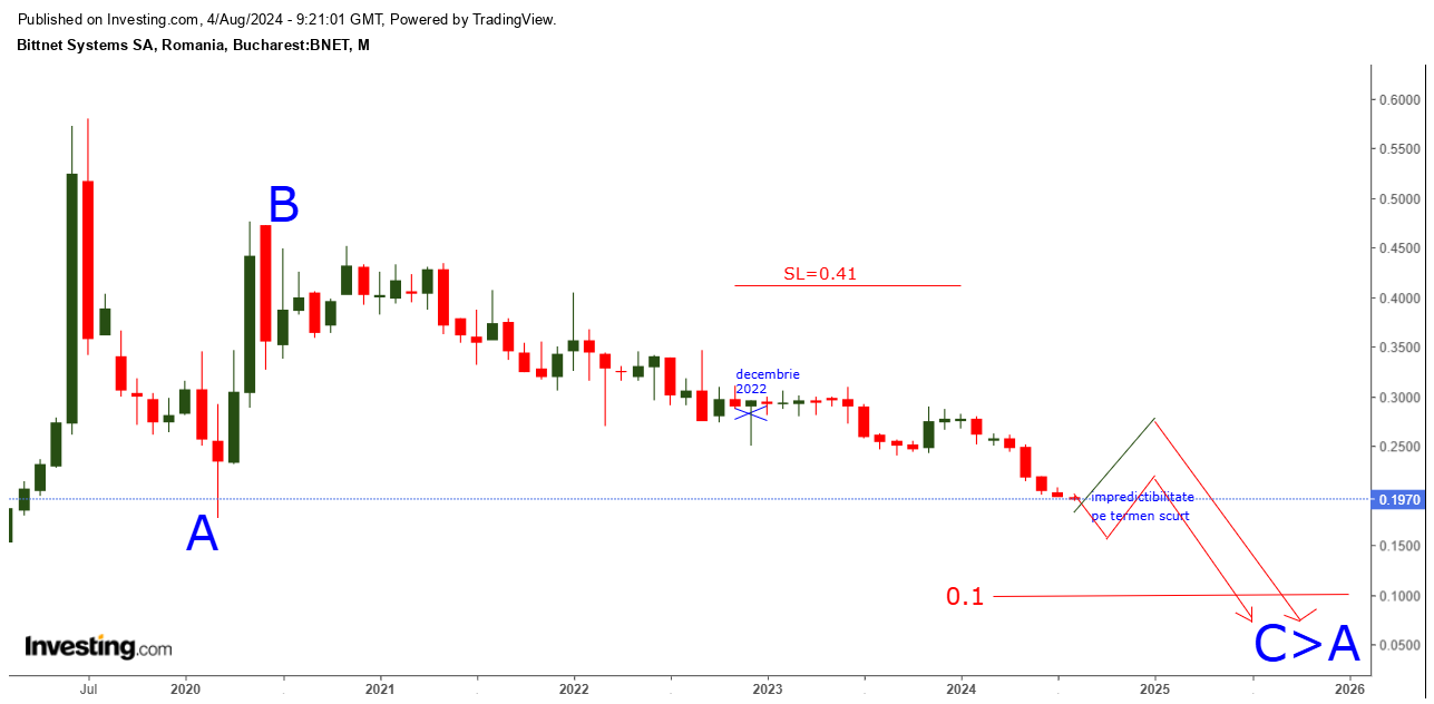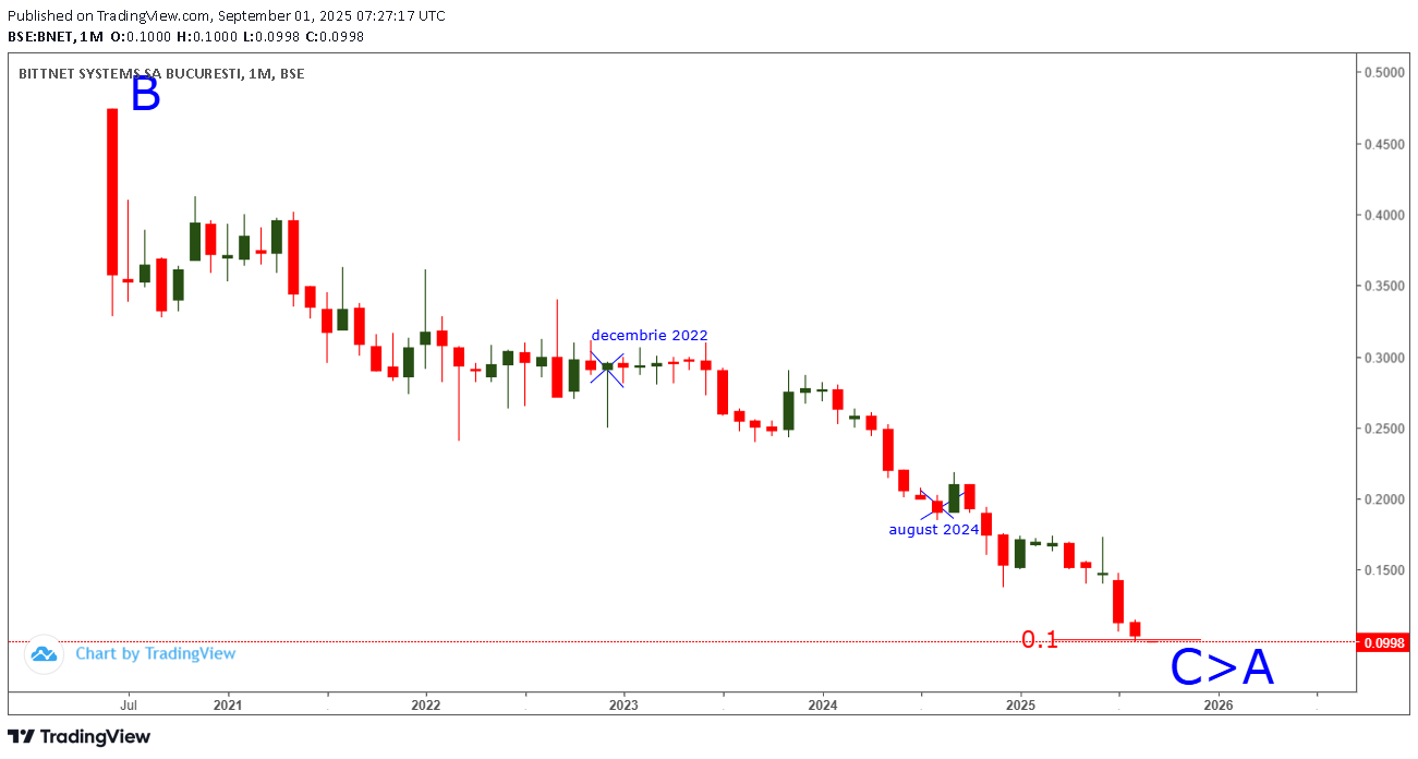 Dupa mai bine de 2 ani jumate de la graficul din 10 decembrie 2022 , BNET cade in sfarsit azi 1 septembrie 2025 sub targetul 0.1 anticipat in decembrie 2022 .