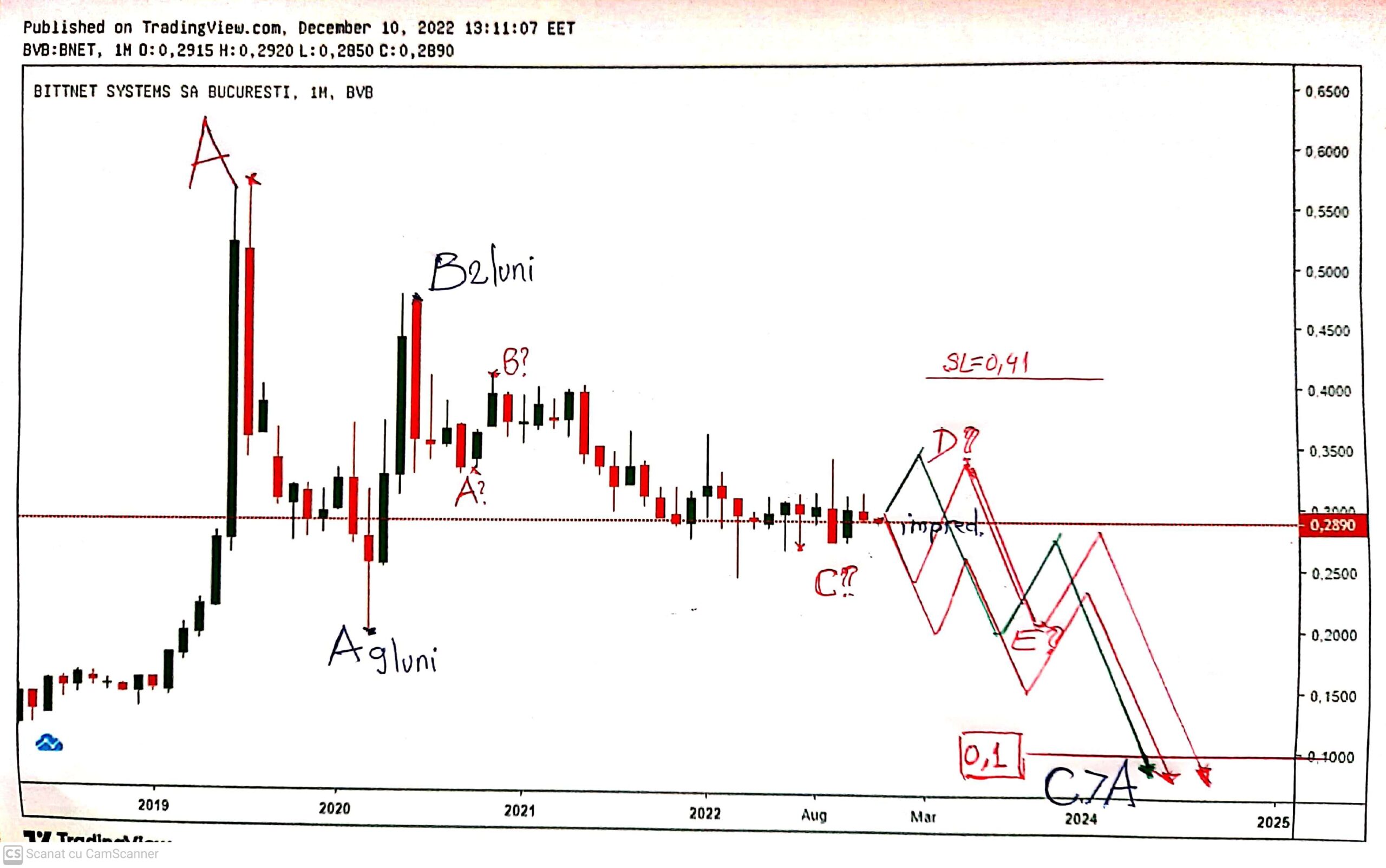 In 10 decembrie 2022 ( la 0.29) anticipam o cadere masiva de cca 65% a BNET sub targetul 0.1 pentru ca valul C ( al triunghiului neutral gigant format pe graficul monthly ) sa fie > decat valul A !!!