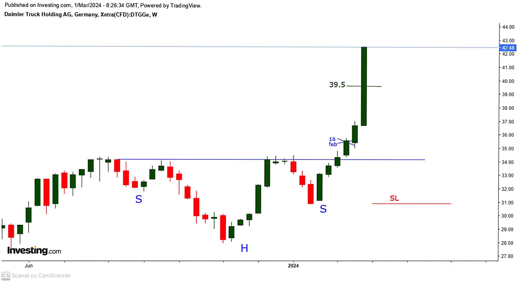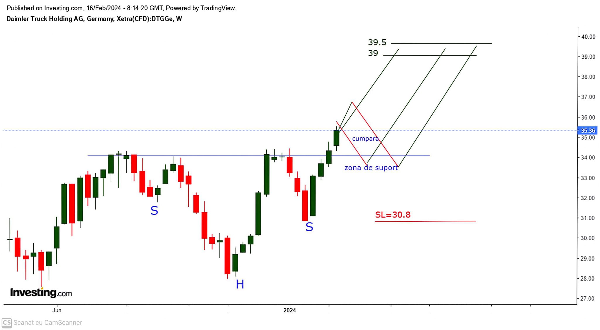 Pe graficul DAIMLER TRUCK HOLDING din 16 februarie ( cand era in jur de 35.3-35.5) inclusa in DAX , atentionam abonatii ca DAIMLER TRUCK ar trebui sa urce in urmatoarele luni spre zona de target 39-39.5 deoarece tocmai a spart linia gatului unui HS de continuare , semnal bullish ca DAIMLER TRUCK ar trebui sa urce spre TP 39-39.5 cata vreme SL 30.8 minimul umarului drept al HS nu era spart ..