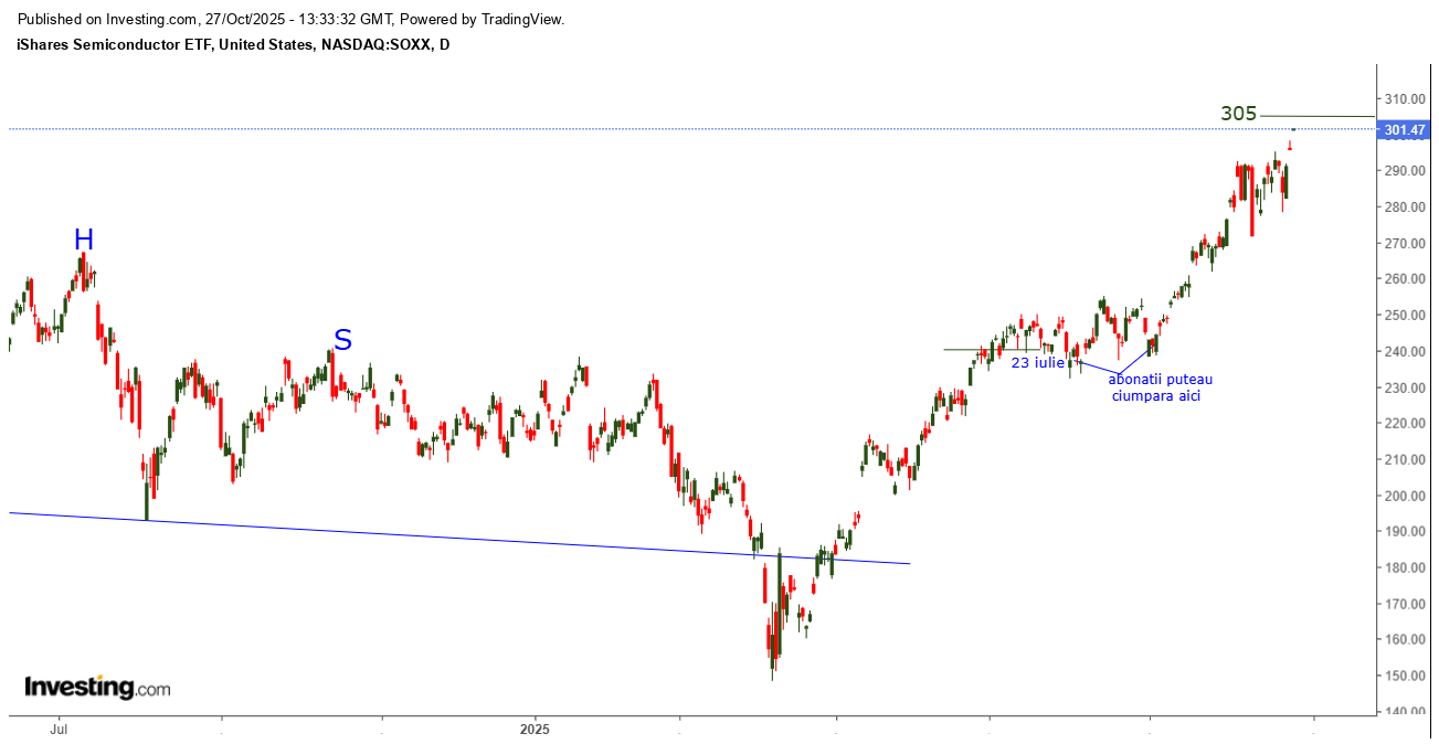 Pe graficul ETF-ului SOXX ( ETF amerixan ce contine actiuni din domeniul tehnologiei semiconductorilor ) din 23 iulie ( cand era sub 240) atentionam abonatii sa cumpere SOXX atunci si pe orice posibila cadere in ideea ca trebuia sa urce spre TP 305 …