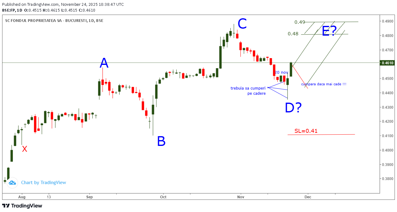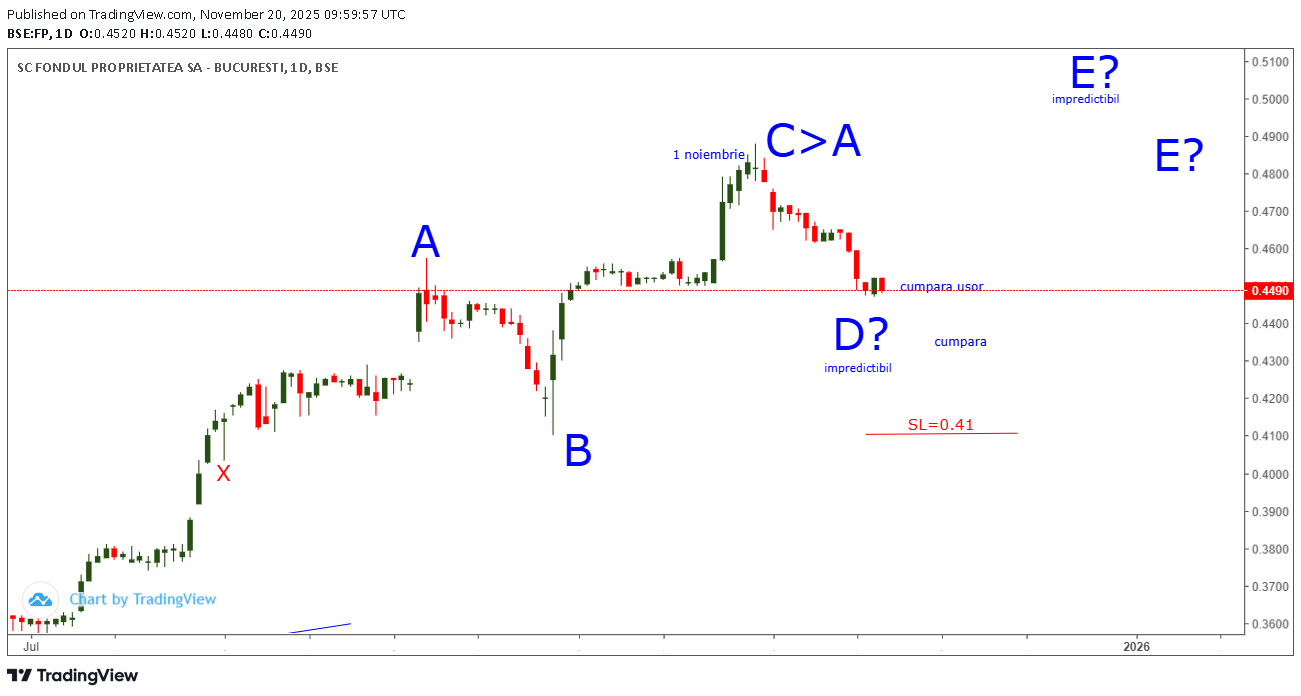 Pe graficul FP din 20 noiembrie ( la 0.45 ) atentionam abonatii sa cumpere FP atunci si DACA MAI CADEA pe valul D spre 0.44-0.43 in ideea ca FP trebuia sa urce iar pe valul E …