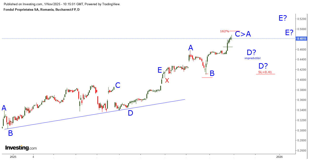 Daca pe graficul din 1 noiembrie ( la 0.48 ) FP urca pe valul C ( al triunghiului neutral format dupa X ) si avertizam abonatii ca FP trebuie sa cada pe valul D impredictibil in zona 0.46-0.44 dupa care iar in sus pe valul E ,