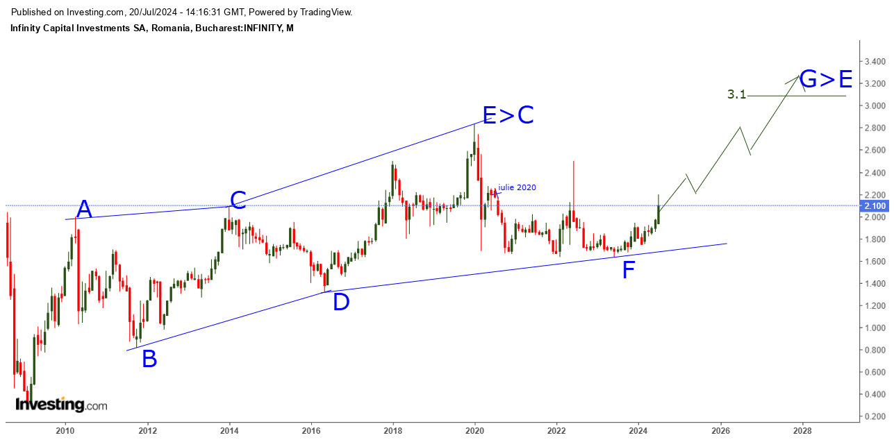 Daca pe graficul INFINITy din 20 iulie 2024 ( la 2.1) din pdv a teoriei valurilor NEOWAVE atentionam abonatii sa cumpere INFINITY deoarece anticipam sa urce puternic cu 50 % , peste 3.1 in urmatorii 1-2 ani pe valul G expansiv final al DIAMETRICULUI cu ultima parte expansiva prezentat pe grafic .