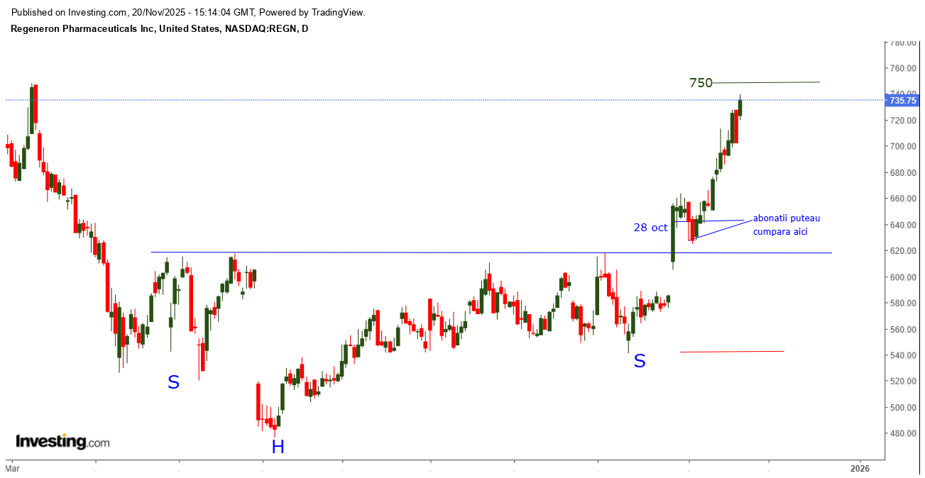 Abonatii care au cumparat REGN ( Regeneron Pharma , companie americana din domeniul farma) in ziua 640-630 imediat dupa semnalul de BUY dat de mine pe graficul din 28 octombrie ,