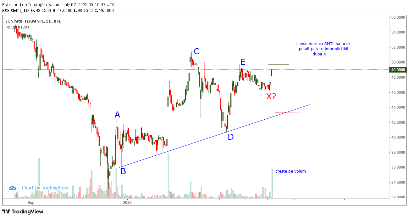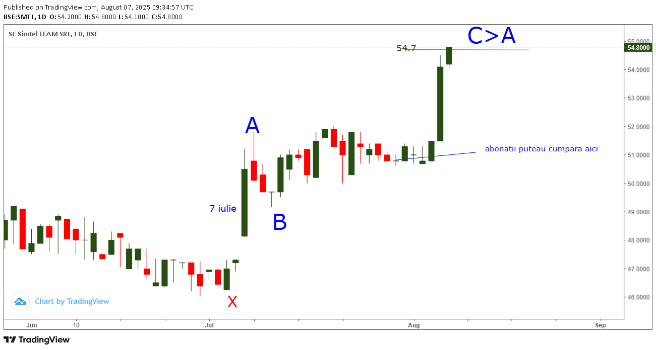 Pe graficul din 28 iulie ( la 51) atentionam abonatii sa cumpere SMTL in ideea ca trebuia sa urce si peste targetul 54.7 pe valul C al triunghiului neutral ce se forma dupa X.