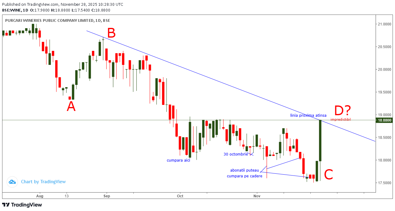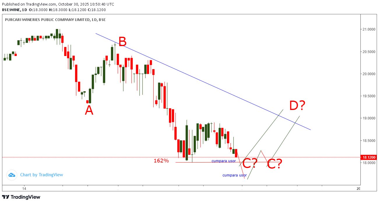 Pe graficul WINE din 30 octombrie ( la 18.1) atentionam abonatii sa cumpere WINE supravandut pe valul C la nivelul de 162% si DACA cadea si mai jos spre 17.7-17.5 , sub pragul de 162% ,